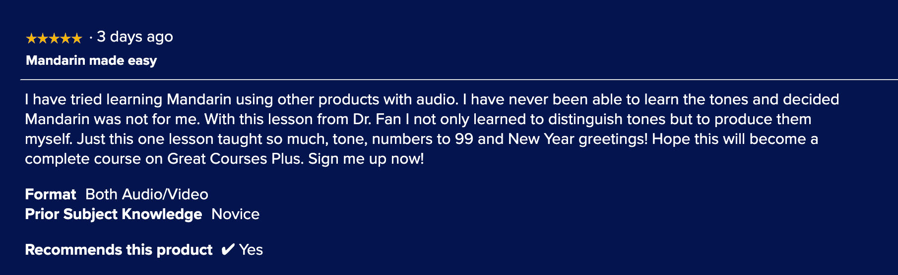 TEDx 2019: "Learn Chinese in the 21st Century."; iF Design Award 2019: Education Category winner.; U.S. National Chinese Speech Contest: 1st Place winners, 2023 & 2024.; Heartland Chinese Teacher Award: 2023 recipient; Feature profile in the Northwest Arkansas Democrat-Gazette Jan 2024; The Great Courses Reviews (4.9/5 stars, 100% recommendation).